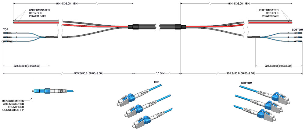 Nominal length equals length of trunk not including top and bottom breakouts; breakout lengths add additionally to the total assembly length tip to tip